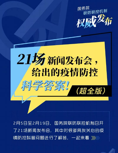 2月5日至2月19日,國(guó)務(wù)院聯(lián)防聯(lián)控機(jī)制召開了21場(chǎng)新聞發(fā)布會(huì),其中對(duì)很多網(wǎng)友關(guān)心的疫情防控科普問題進(jìn)行了解答,一起來看。