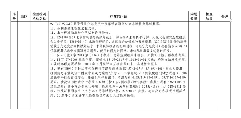 序號 | 地區 | 檢驗檢測機構名稱 | 問題數量 | 檢查結果 |